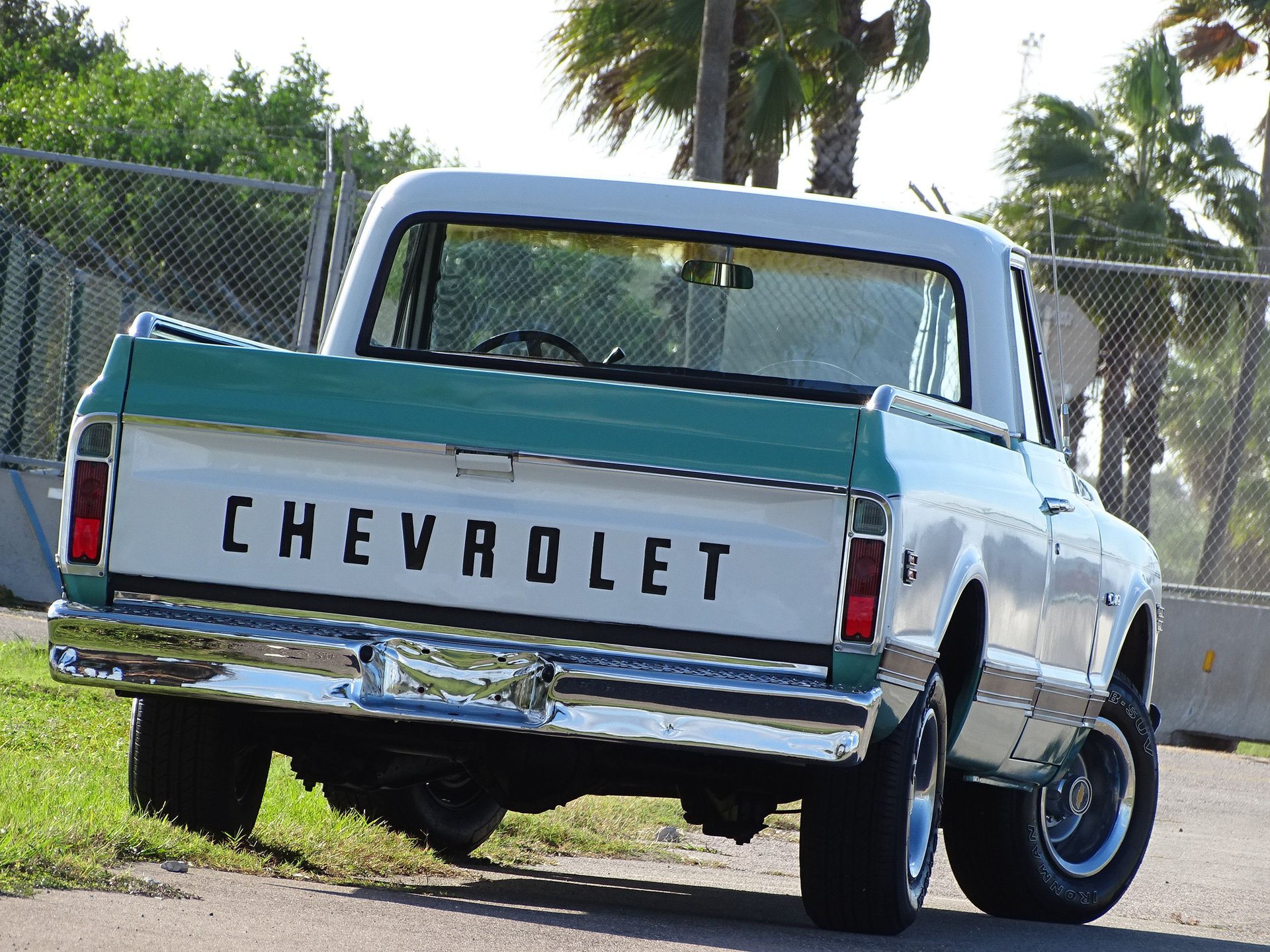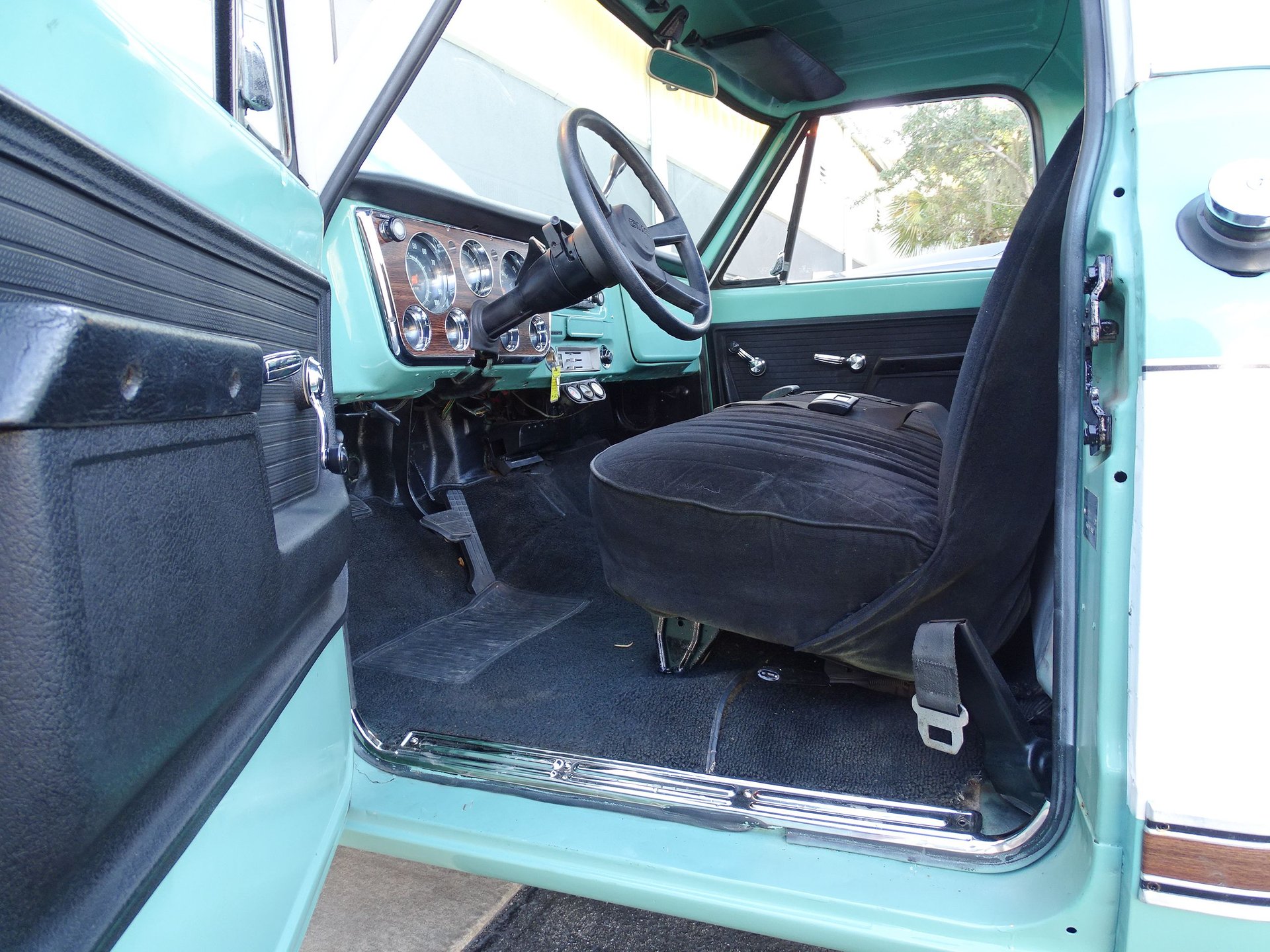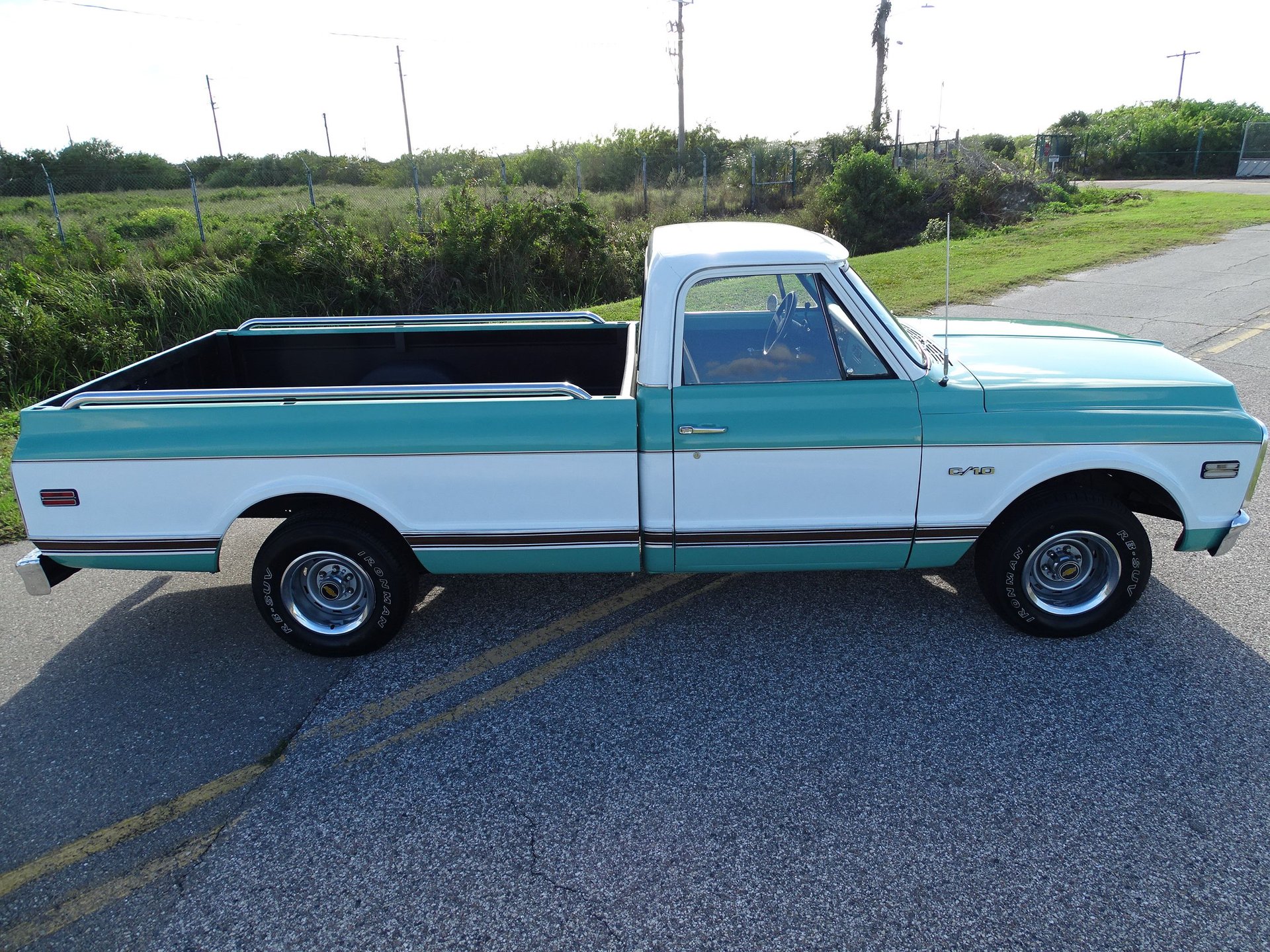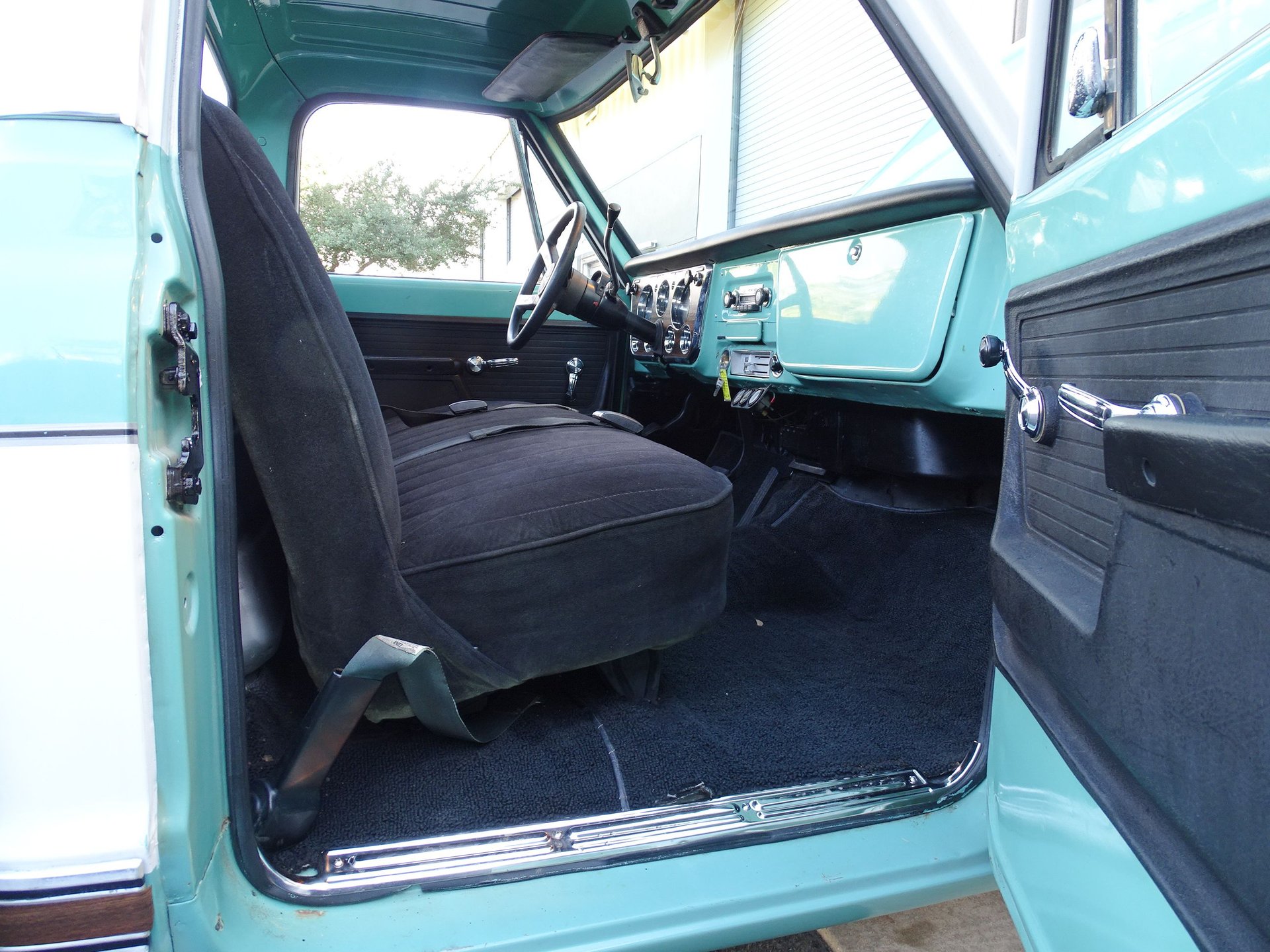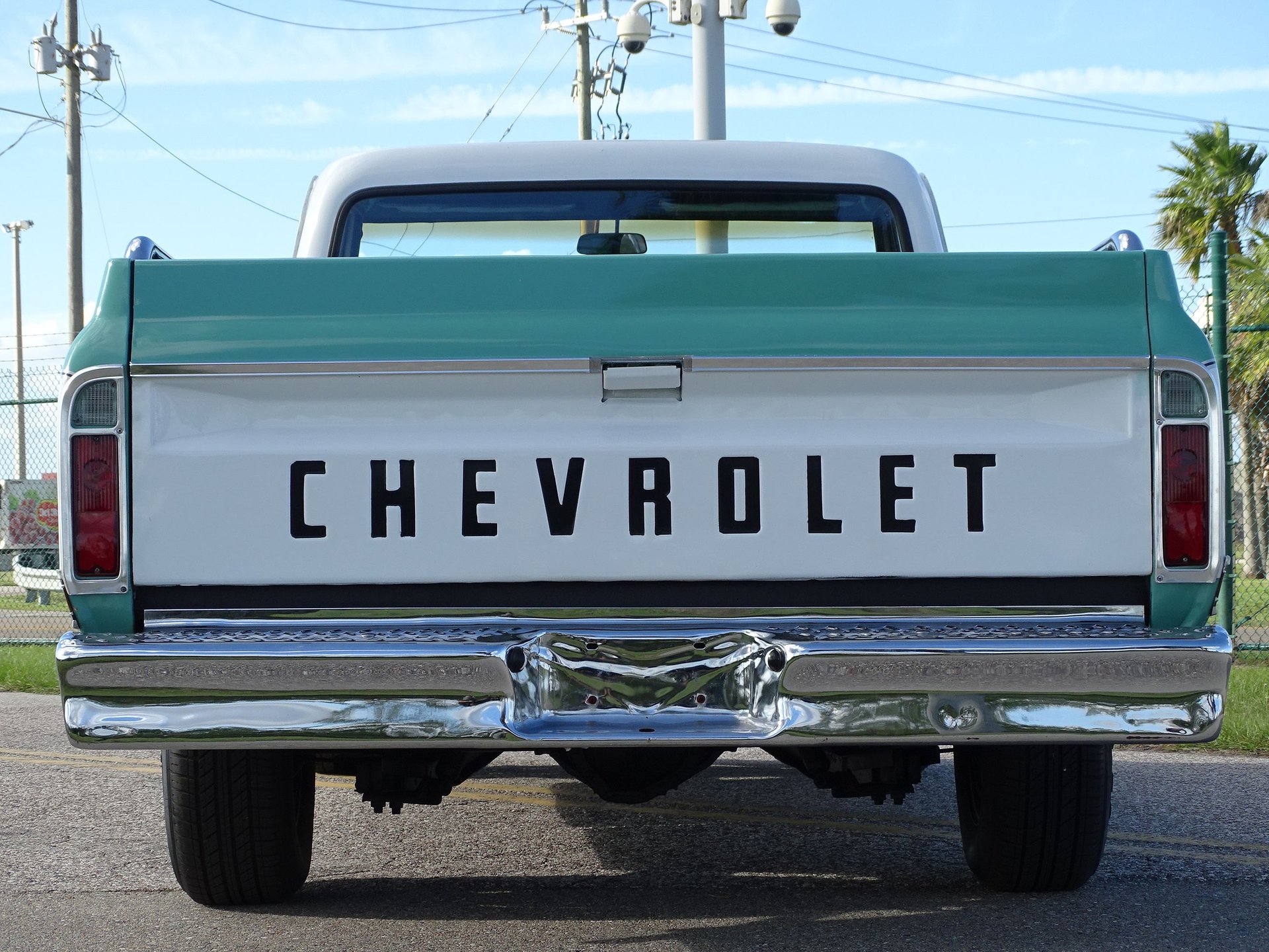 The 1967-1972 Chevrolet C10 is an American Icon. They are, in many circles, considered to be one of the best looking trucks ever produced. When they are two-tone with rally wheels and a great color combination, it is easy to see why. This beauty is painted in a gorgeous Seafoam Green and White with the Cheyenne woodgrain trim. Rally wheels wrapped in radial tires are always a crowd please. Peek over the chrome bedrails and you will be pleasantly surprised with a new spray-in bedliner. That makes this truck not only clean and presentable for shows, but also very usable! The interior is clean and shows well with a comfortable cloth covered bench seat. Pop the hood to see a nicely detailed small block Chevy V8 with a nice dress up kit and a serpentine belt system. Keen eyes will spot the A/C compressor that has been installed. It is the start to a cool summer cruiser if you choose to finish off the A/C system. Power steering makes this truck easy to handle, even on curvy backroads. This particular C10 has the coil spring rear end for a much-improved ride over the leaf spring style. The underside is nicely detailed and given a coat of black rust proofing paint to protect your investment for years to come. The 350 CID V8 has been given a bit more power with an Edelbrock 4-barrel carburetor with electric choke. That power is sent through a smooth shifting 3-speed automatic transmission, controlled on the column.