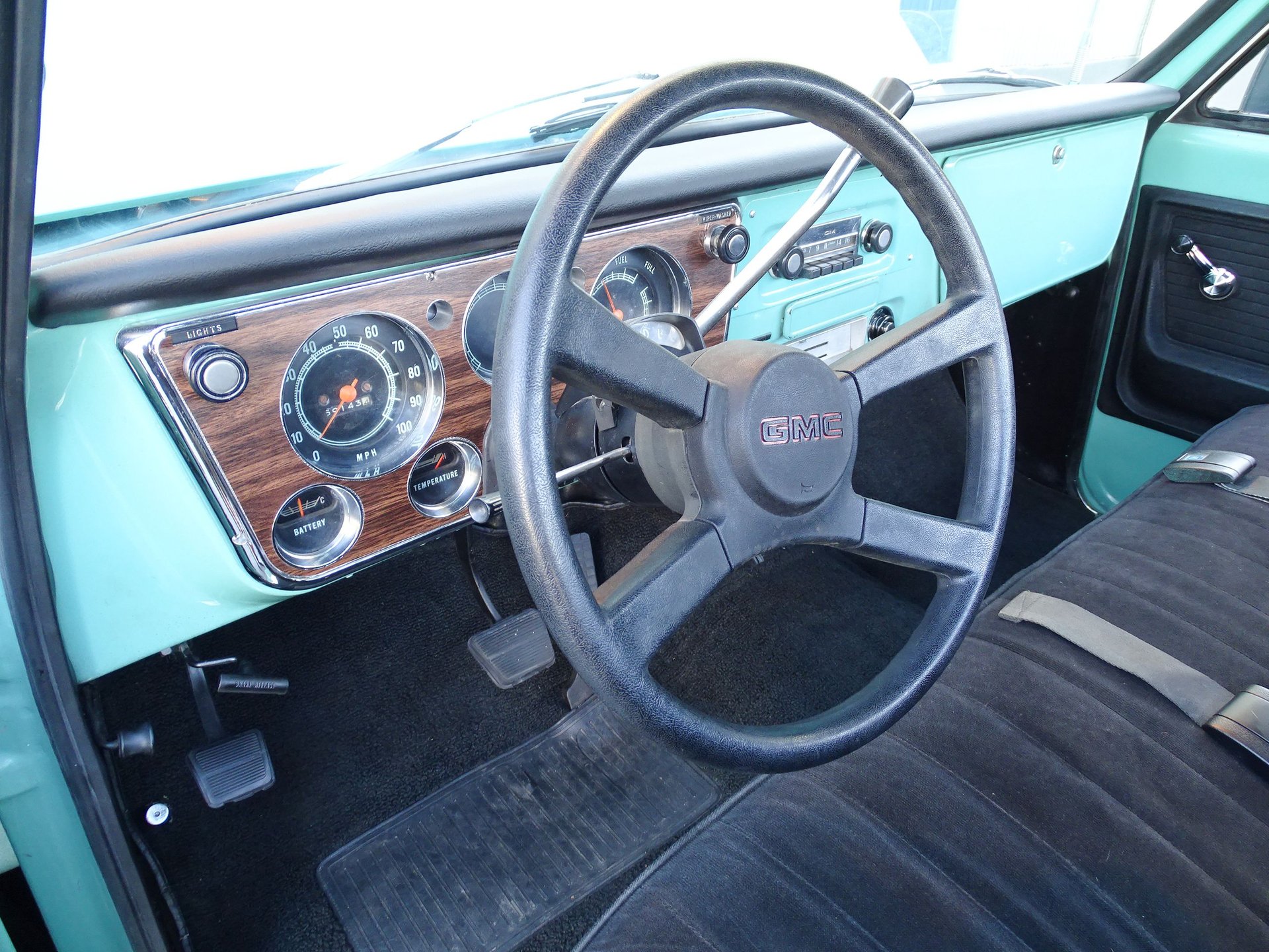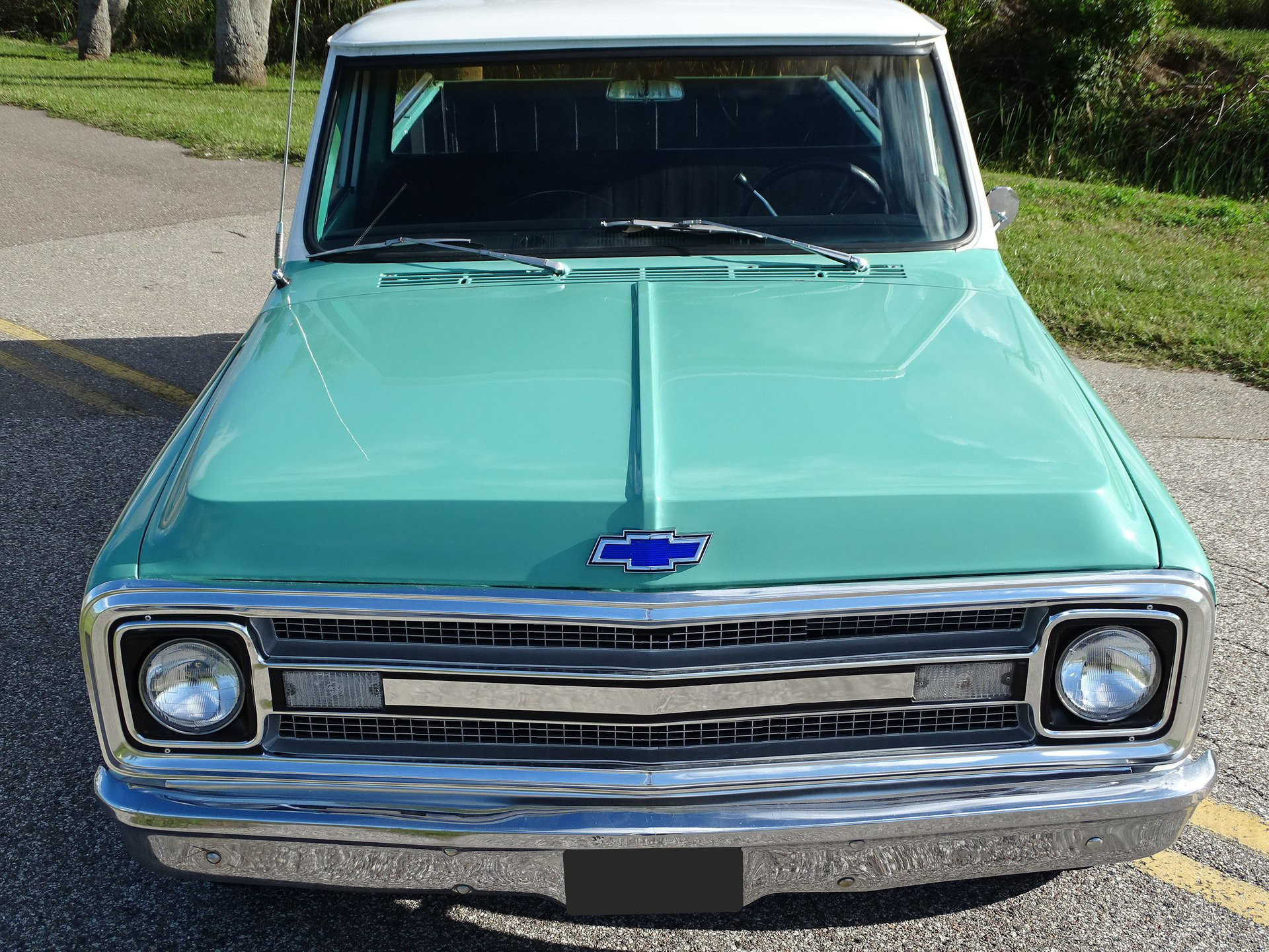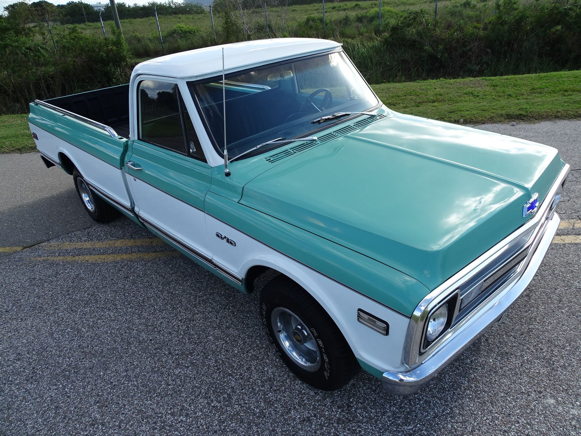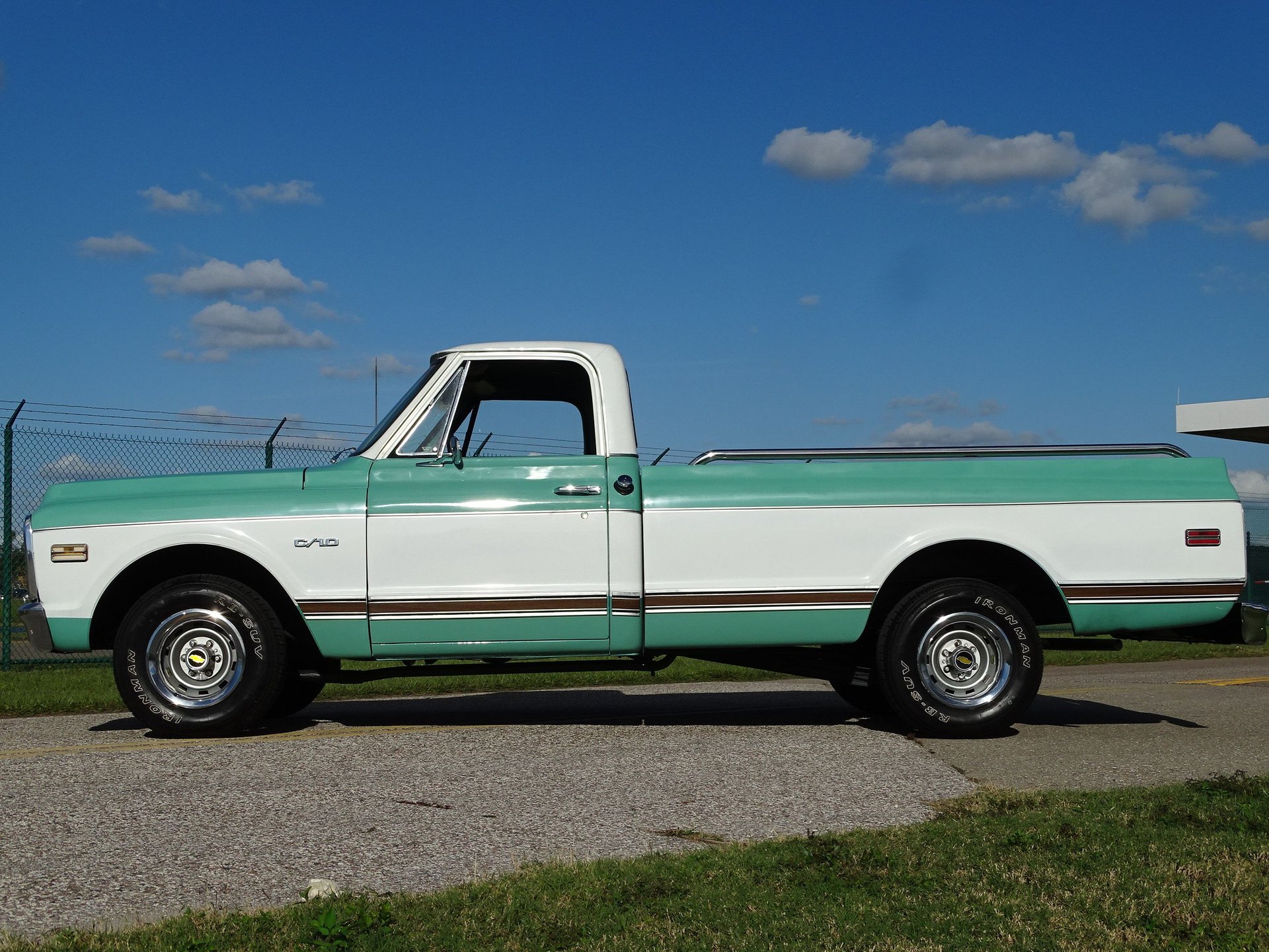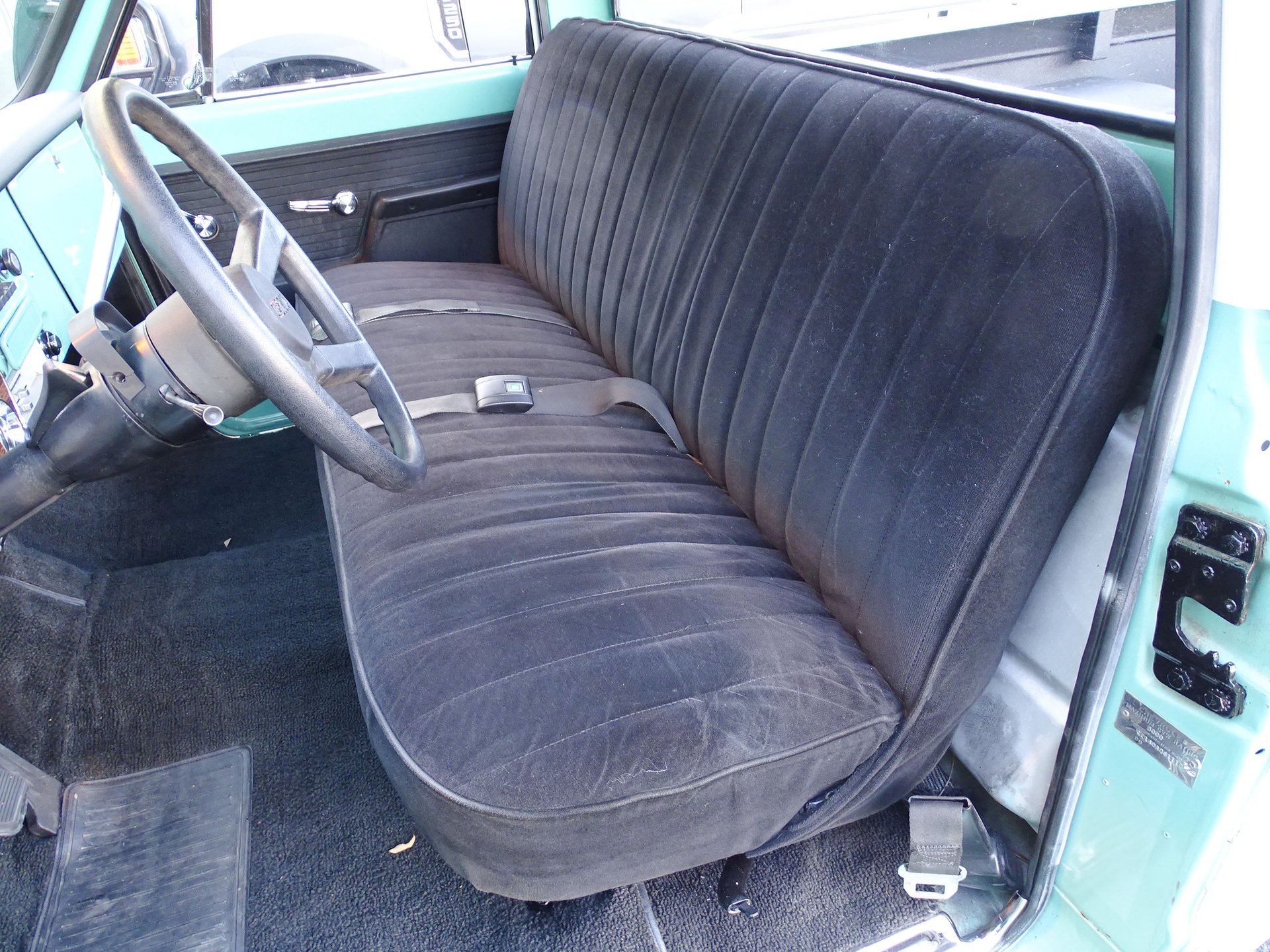 The 1967-1972 Chevrolet C10 is an American Icon. They are, in many circles, considered to be one of the best looking trucks ever produced. When they are two-tone with rally wheels and a great color combination, it is easy to see why. This beauty is painted in a gorgeous Seafoam Green and White with the Cheyenne woodgrain trim. Rally wheels wrapped in radial tires are always a crowd please. Peek over the chrome bedrails and you will be pleasantly surprised with a new spray-in bedliner. That makes this truck not only clean and presentable for shows, but also very usable! The interior is clean and shows well with a comfortable cloth covered bench seat. Pop the hood to see a nicely detailed small block Chevy V8 with a nice dress up kit and a serpentine belt system. Keen eyes will spot the A/C compressor that has been installed. It is the start to a cool summer cruiser if you choose to finish off the A/C system. Power steering makes this truck easy to handle, even on curvy backroads. This particular C10 has the coil spring rear end for a much-improved ride over the leaf spring style. The underside is nicely detailed and given a coat of black rust proofing paint to protect your investment for years to come. The 350 CID V8 has been given a bit more power with an Edelbrock 4-barrel carburetor with electric choke. That power is sent through a smooth shifting 3-speed automatic transmission, controlled on the column.