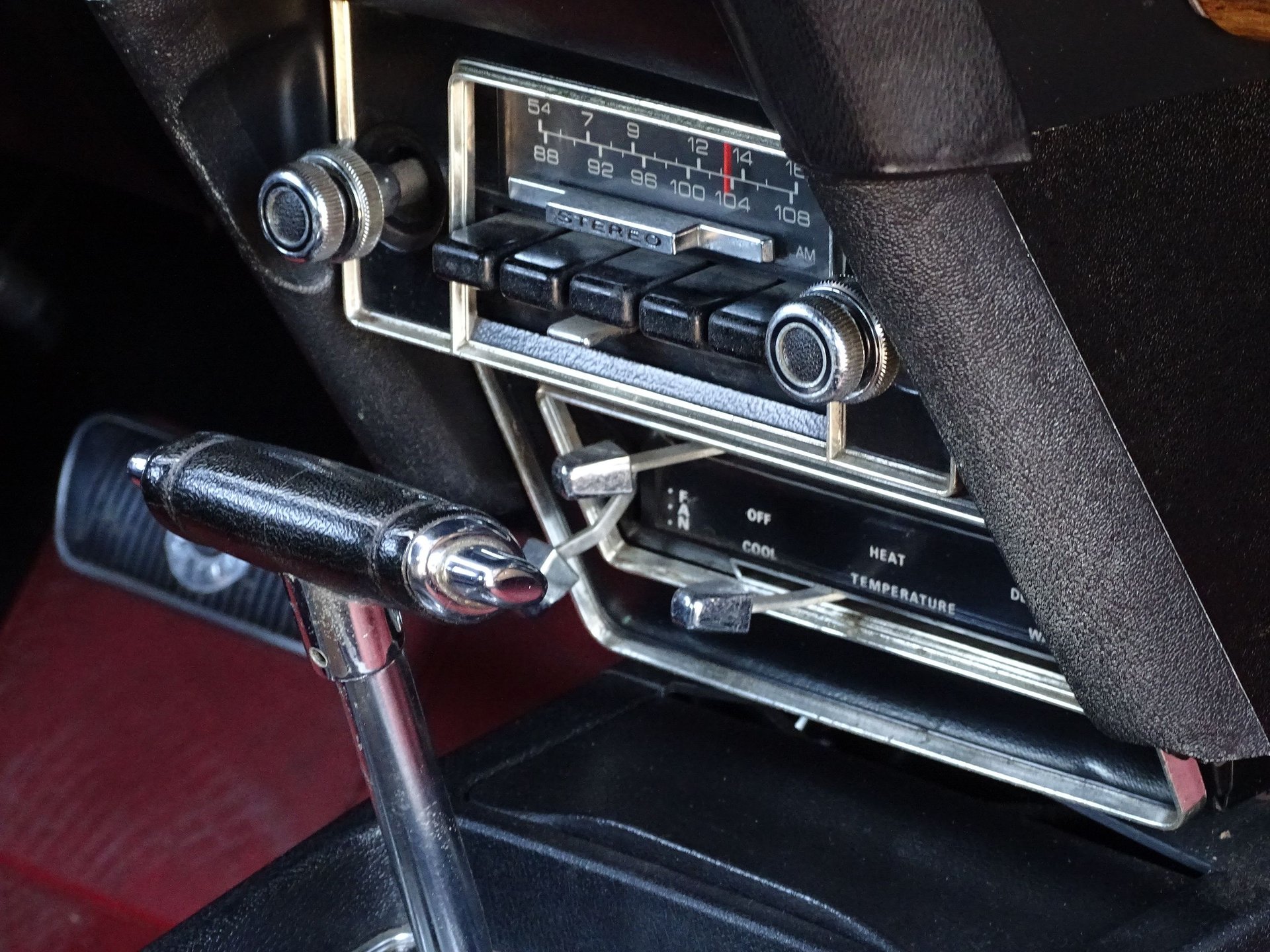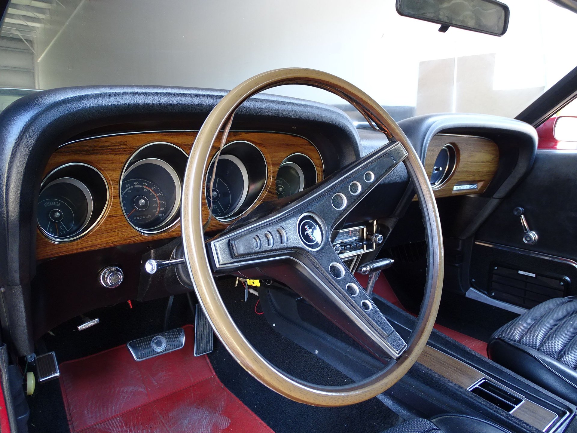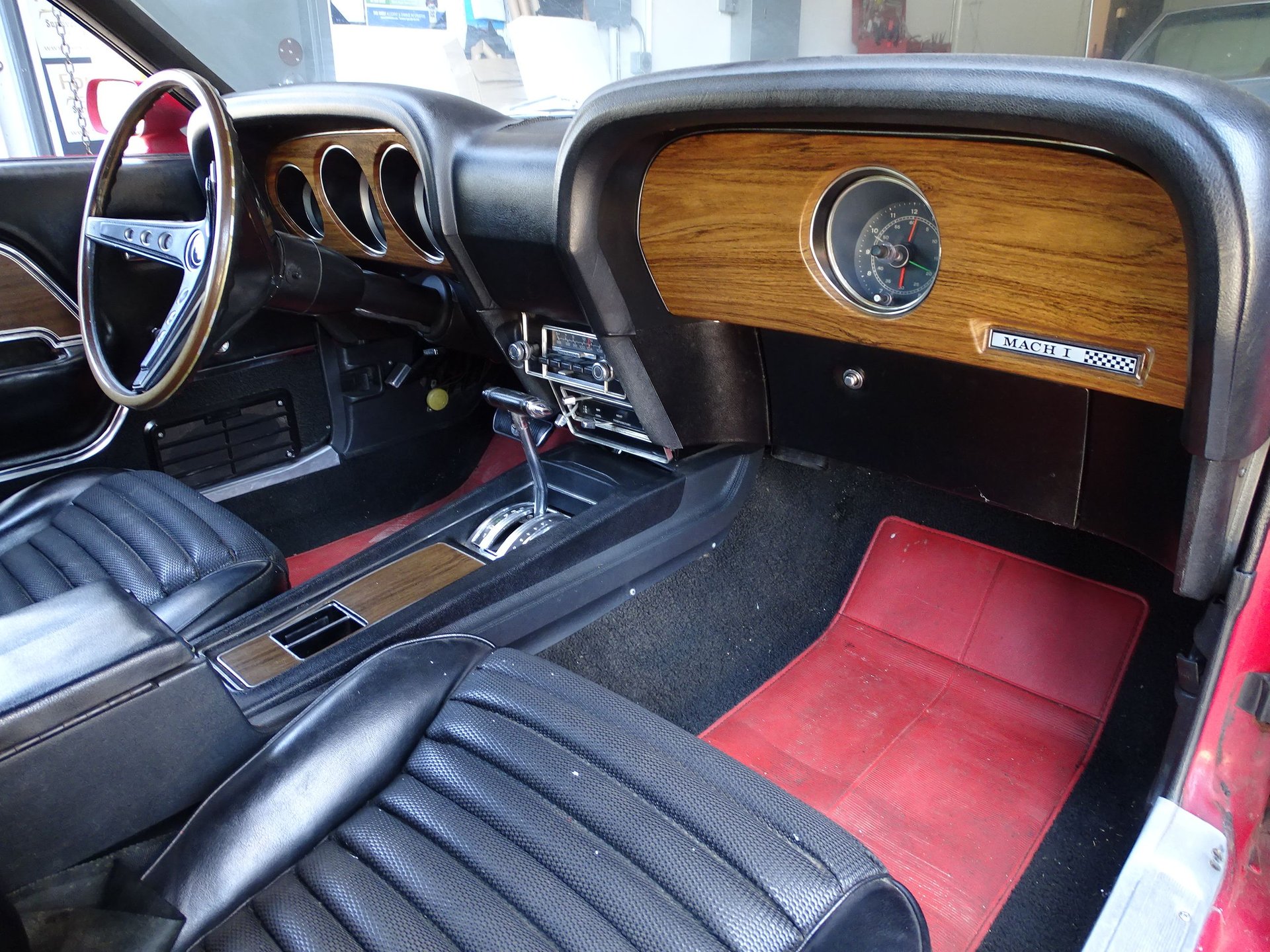 With a rear spoiler, bold painted hood stripes, rear window louvers and the Mach 1 striping and badging, everyone will know this car is a true muscle car. The Mach 1 package included Clarion Knit Corinthian Vinyl bucket seats with woven vinyl and woodgrain accents to spruce up the interior versus a standard Mustang. The round clock above the glovebox is what collectors want to see inside these cars, and the interior is left as stock as can be.